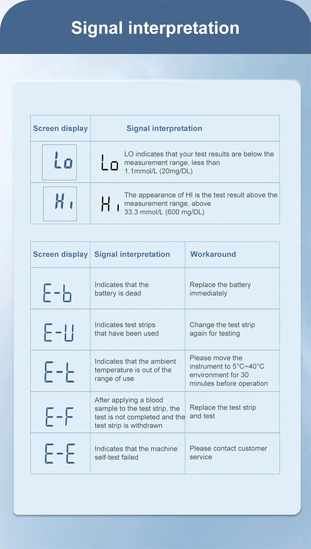 Système intelligent LO/HI : alerte en cas de taux anormalement bas (moins de 20 mg/dL : LO) ou élevé (plus de 600 mg/dL : HI).